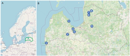 Location of Latvia within northern Europe (A). Location of paludiculture implementation and cultivation sites discussed in the text: (1) Nida (Phragmites); (2) Lake Svetes vicinity (Alnus glutinosa); (3) Engure (Phragmites); (4) Ķemeri Bog (Sphagnum); (5) Kaigu Bog (Sphagnum); (6) Rāķa Bog (Sphagnum); (7) Tēvgāršas Bog (Typha); (8) Rūja River floofplain valley (Phalaris); (9) Ķēviešu Bog (Sphagnum) (B).