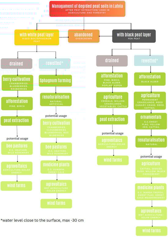For a visual overview of the current and potential utilization of organic peat soils in Latvia, encompassing forestry, agriculture, and peat extraction, please refer to Figure 2. The management of these peat soils involves a combination of drainage and rewetting methods, which encompass both natural-origin and artificially established sites. Drained peat soils with a sphagnum peat layer have traditionally found use primarily in berry cultivation, afforestation, and peat extraction. However, these versatile landscapes also offer opportunities for more sustainable and ecologically conscious practices, such as establishing bee pastures adorned with flora like heather and wild rosemary, which can be harmoniously combined with renewable energy sources like solar panels or windmills.
