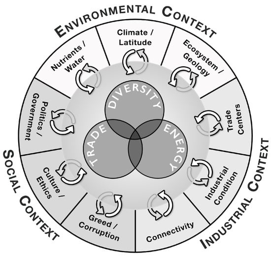 Past research has indicated that the structure of an economy or ecosystem is defined by only energy flows [36,37,38]. While energy is certainly essential to the structure and functioning of economies and ecosystems, the central hypothesis here is that three foundational components—diversity, energy, and trade (i.e., resource transfers)—comprise the core structure of economies and ecosystems. These components form predictable interactions with one another, while being connected via feedback loops with an economy’s social-environmental-industrial (SEI) context. An economy’s social context includes its cultural values, models of governance, desired levels of productivity, etc. Its environmental context includes soil fertility, precipitation, the quality of natural resources, etc. Whilst, its industrial context includes technology, the quantity and connectivity of trade centers, infrastructure, etc. The full structure of an economy is defined herein as the balance of its foundational components—diversity, energy, and trade—in relation to the SEI context in which they exist (Figure 1).