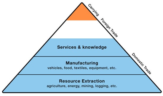 Adam Smith posited that the strength of a nation’s domestic trade—not its foreign or carrying trade—forms the basis of its wealth [122]. That foundation, he argued, is sustained by a country’s manufacturing and resource extraction sectors. A conceptual representation of Smith’s trade paradigm, similar to the biomass pyramid of ecosystems, is the balanced trade pyramid (Figure 4). The majority of trade is domestic, and over fifty percent of domestic production is generated by agriculture, manufacturing, and other “productive” industries.