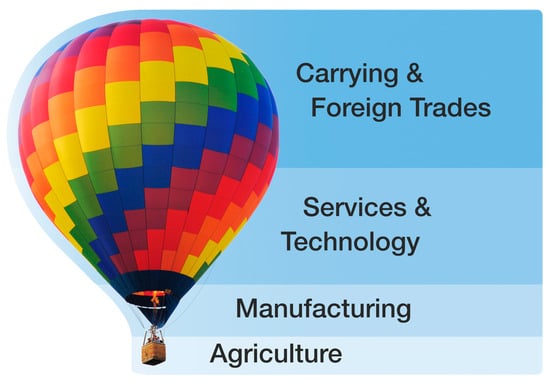 Today, U.S. agricultural and other extractive industries comprise less than 4% of GDP, and manufacturing contributes 11% of GDP [124,125]. Over 70% of GDP is derived from services, finance, IT, and other non-productive industries. Conceptually, the U.S. trade condition has shifted from a pyramid to a hot air balloon over the past 120 years (Figure 5). Carrying and foreign trades dominate the top two-thirds of the balloon. The service and knowledge sectors fill a greater volume of the domestic trade, sustained not by the productive labor of the U.S., but that of other countries. The balloon, conceptually, remains aloft by exogenous energy, the carrying trade, and imported products.