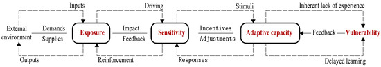Traditional villages continually interact with nature and society, engaging with matter and information to meet the needs of their inhabitants (Figure 1). These interactions lead to exposure (the extent of encountering harm) as they are influenced by external factors. In order to adapt to the external environment, villages not only develop structural states that match the available resources and production methods of their time but also become reliant on the external environment. Their own structure and external dependency determine their response to environmental changes, which defines sensitivity. As villages interact with the external environment, they continuously adjust their own structures to maintain their ability to obtain resources from the outside, leading to adaptive capacity. However, inadequate inherent adaptive capacity to cope with current environmental changes and delayed learning in acquiring postnatal adaptive capacity can create difficulties in balancing exposure, sensitivity, and adaptive capacity, resulting in vulnerability. Although villages may achieve stability again after making adjustments and improvements, the interactive process among exposure, sensitivity, and adaptive capacity has already impacted the village’s values. Thus, during the interactive cycle of “exposure-sensitivity-adaptive capacity,” the vulnerability of traditional villages persists and dynamically changes.