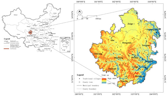 Aba Tibetan and Qiang Autonomous Prefecture (Aba Prefecture) is situated in the northwest of Sichuan Province, China, with geographical coordinates between 100°30′ E–104°27′ E and 30°35′ N–34°19′ N (Figure 2). It lies at the combination of the northern end of the Hengduan Mountains and the high mountain gorges of northwestern Sichuan. The region is renowned for biodiversity conservation and water source preservation. It is one of the areas severely affected by the Wenchuan earthquake and is a concentrated poverty area in China. The average elevation of the terrain ranges from 3500 to 4000 m, with topography changing from high mountains and gorges in the east to hills and plateaus in the west, with a gradual increase in elevation and decrease in valley cutting intensity. Aba Prefecture consists of one city and twelve counties, covering an area of approximately 84,200 km2. By the end of 2019, 123 villages in Aba were on the conservation list, mainly concentrated in the junction area between Li County and Wenchuan County, the central part of Heishui County, and the southeastern part of Jiuzhaigou County. The elevations of the villages are mainly concentrated between 1000 and 3500 m, accounting for 84.55% (104 villages) of the total. There are 18 villages with elevations above 3500 m, accounting for 14.63%.
