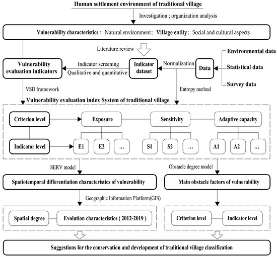 Facing the trend of multidimensional and comprehensive development in vulnerability research, this study summarizes the main vulnerability characteristics of traditional villages in Aba in three aspects (Figure 3), taking into account the existing knowledge base of human settlement environmental systems [54,55] and vulnerability classification [56,57,58,59]. Among them, the characterization of the natural environment, social, and cultural aspects mainly reflect the problems of the village in terms of natural, ecological, social, economic, and cultural recognition. The content of “village entity” is mainly used to describe the problem of the value carrier of village heritage, to highlight the particularity of the understanding of the vulnerability of traditional villages. Through the literature review, index use frequency statistics, expert consultation, and other methods, this study formulates vulnerability assessment indicators for traditional villages, and applies a combination of qualitative and quantitative methods to determine the final indicators to be used. Finally, the identification and analysis of vulnerability spatiotemporal differentiation characteristics and influencing factors are realized by function modeling.