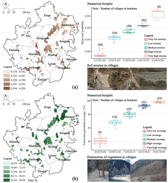- Soil Erosion Vulnerability [60]: There are 92 traditional villages with mean soil erodibility values exceeding the average value of all villages in Aba Prefecture. Among them, 47 villages are classified as susceptible to erosion or highly susceptible (Figure 4).