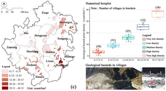 Figure 4. Vulnerability status and spatial distribution of natural environment in traditional villages in Aba Prefecture (2019). (a) Mean soil erodibility, (b) forest and grassland coverage, (c) geological hazard point density. (Self-drawn by the author). - Reduced Vegetation Coverage [61]: The average Normalized Difference Vegetation Index (NDVI) of traditional villages has decreased from 0.802 (in 2010) to 0.799 (in 2018). There are 26 traditional villages with lower vegetation coverage than the regional average, with 18 villages having low or relatively low vegetation coverage.
