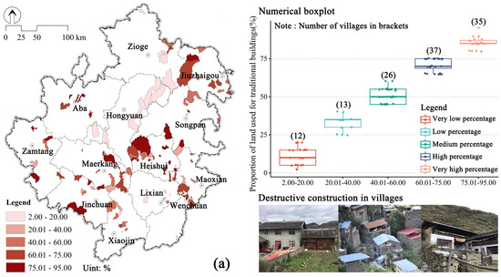 - Decline in Traditional Building Utilization and Landscape Degradation: By the end of 2019, 54 traditional villages had less than 50% of their land occupied by traditional buildings (Figure 5). Among them, 17 villages in Hongyuan, the central part of Li County, and the northern part of Zoige (Ruo’ergai) had less than 20% of land occupied by traditional buildings. In 25 villages in the northern part of Zoige, Hongyuan County, and the western part of Heishui County, the utilization rate of traditional buildings had dropped below 50%. Over 90% of traditional villages faced challenges of modernized decoration, unregulated renovations, and damage to traditional buildings. Additionally, 51 traditional villages had poorly preserved and utilized special spaces, such as blockhouses and religious facilities.