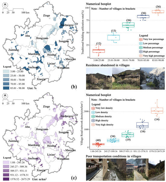 Figure 5. Vulnerability status and spatial distribution of village entity in traditional villages in Aba Prefecture (2019). (a) Proportion of traditional building land to total village construction land, (b) traditional building utilization rate, (c) village Road network density. (Self-drawn by the author). - Inadequate Basic Service Provisions: Village infrastructure suffered from issues such as inadequate facilities, insufficient operational security, significant differences in service quality, weak disaster resistance, and incomplete management systems [63,64].