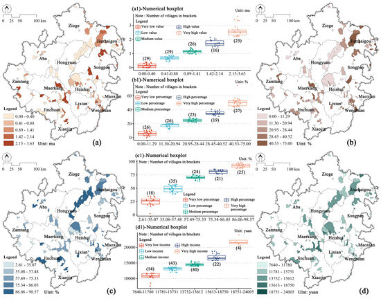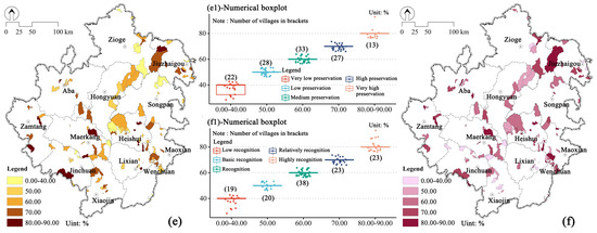 Figure 6. Vulnerability status and spatial distribution of social and cultural aspects in traditional villages in Aba Prefecture (2019). (a) Per capita arable land, (a1) boxplot of per capita arable land, (b) rate of unused production land, (b1) boxplot of unused production land ratio, (c) proportion of primary industry income in village output, (c1) boxplot of the proportion of primary industry income, (d) per capita disposable income of farmers and herdsmen, (d1) boxplot of per capita disposable income, (e) degree of traditional customs preservation, (e1) boxplot of the preservation degree of traditional customs, (f) village cultural recognition level, (f1) boxplot of village cultural recognition level. (Self-drawn by the author). - Overreliance on Single Industries and Slow Economic Development [66]: With industrial business concentrated in industrial parks, traditional villages primarily rely on the development of agriculture and animal husbandry, and tourism. The primary industry income accounts for over 50% in 82 traditional villages, with 48 villages having a primary industry income exceeding 75%. The disposable income of farmers and herdsmen in 71 villages is below the regional average. Moreover, 112 villages have production and operation costs higher than the regional average. The tourism development in villages is at an initial stage and easily disrupted by disasters [67].
