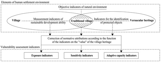 Vulnerability holds diverse interpretations across various disciplines and fields [39]. The natural sciences perceive vulnerability as the degree or likelihood of being affected by adverse impacts, while the social sciences emphasize the system’s capacity to withstand such impacts and focus on the reasons behind vulnerability generation [40]. According to the IPCC, vulnerability is the extent to which a system is susceptible to climate change or lacks the ability to cope with its adverse effects. It depends on climate change characteristics, magnitude, and rate within a system, along with its sensitivity and adaptive capacity as their function [41]. Vulnerability is regarded as an inherent attribute of a system [42], exhibiting relative and dynamic characteristics [43]. Exposure is used to describe the degree to which a system is exposed to hazards. A high exposure reflects the fact that a system is more exposed to perturbations, which may lead to higher vulnerability [44]. Sensitivity reflects the degree of stabilization of a system in response to perturbations. High sensitivity signals that a system is highly susceptible to developing unstable states that may lead to higher vulnerability [45]. Adaptive capacity reflects the ability of a system to recover from a perturbation. A high adaptive capacity predicts a higher ability of a system to cope with the impacts of a perturbation and a faster recovery from the perturbation, thus reducing the vulnerability of the system [46]. The “exposure-sensitivity-adaptive capacity” framework (vulnerability scoping diagram, VSD) is widely employed [47,48,49,50,51]. Concurrently, values are the core basis for heritage identification, evaluation, conservation, and management [52], and the ultimate goal of heritage disaster risk analysis is to understand “how values are affected” [53]. Consequently, vulnerability of traditional villages refers to the degree of sensitivity a village system has towards disturbances from natural and human activities, resulting in structural and functional changes due to inadequate adaptive capacity, ultimately leading to unfavorable scenarios for the village’s values.