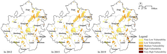 Spatial distribution of vulnerability of traditional villages in Aba Prefecture in different years. (Self-drawn by the author).