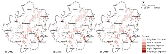 Between 2012 and 2019, the exposure of traditional villages displayed a fluctuating increasing trend while the coefficient of variation decreased, indicating an overall enhancement in the exposure level among villages, with reduced differences among them. The number and proportion of villages with very high and low exposure remained relatively stable, whereas the number of villages with very low exposure fluctuated and decreased, and the number of villages with high and medium exposure gradually increased (Table 4). The transition from very low exposure to medium and high exposure primarily occurred in the southern region of Maerkang City, Jinchuan County, Xiaojin County, the eastern region of Jiuzhaigou County, and Mao County (Figure 9). Villages with relatively high exposure were concentrated in the junction area of Mao, Li, and Wenchuan counties, while villages in the eastern part of Zoige, western Jiuzhaigou County, northern Hongyuan County, western Heishui County, and eastern Maerkang City had relatively low exposure.