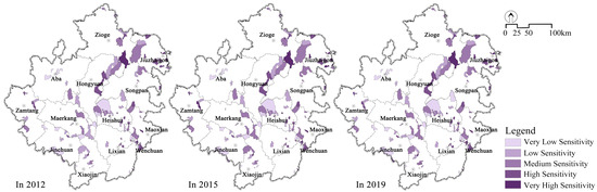 Spatial distribution of sensitivity of traditional villages in Aba Prefecture in different years. (Self-drawn by the author).