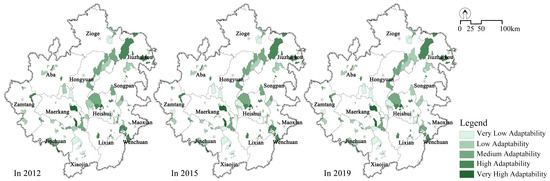 Spatial distribution of adaptability of traditional villages in Aba Prefecture in different years. (Self-drawn by the author).
