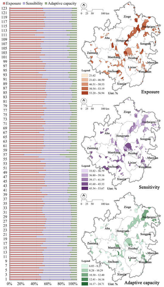Among the total of 115 villages, the main obstacle to vulnerability came from exposure, with obstacle degree values ranging from 42.88% to 56.94%. High-value “hotspot” areas were distributed in the eastern part of Zoige County, the northern part of Hongyuan County, and the western part of Jiuzhaigou County. Low-value aggregation areas were mainly distributed in the central part of Heishui County and the junction area of Wenchuan County, Li County, and Mao County. Villages in the southeastern part of Jiuzhaigou County and the junction area of Wenchuan County, Li County, and Mao County showed significant annual variations in the impact of exposure.