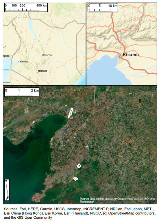 (top left) Overview of Kenya with location of Kisumu indicated; (top right) overview map of Kisumu; (bottom) Kisumu with field sites indicated in white.