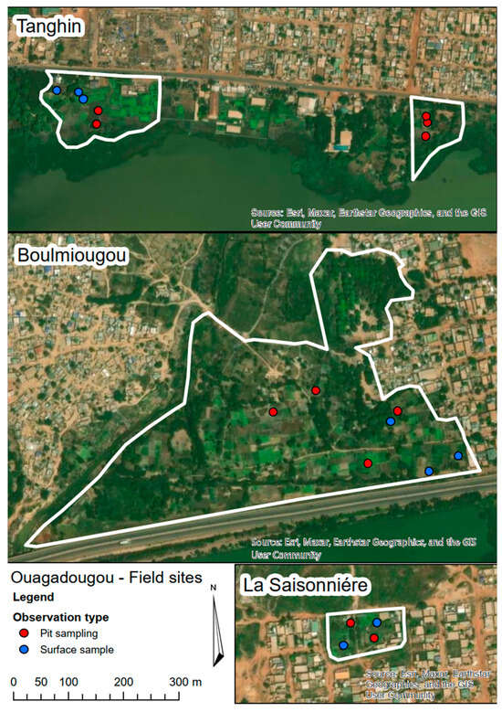 Field sites with sampling locations and types indicated. (top) Tanghin site; (middle) Boulmiougou site; (bottom right) La Saisonnière site. Sampling and observation locations are indicated in red when a soil pit was dug and in blue when only the topsoil was sampled (0–20 cm of the soil).