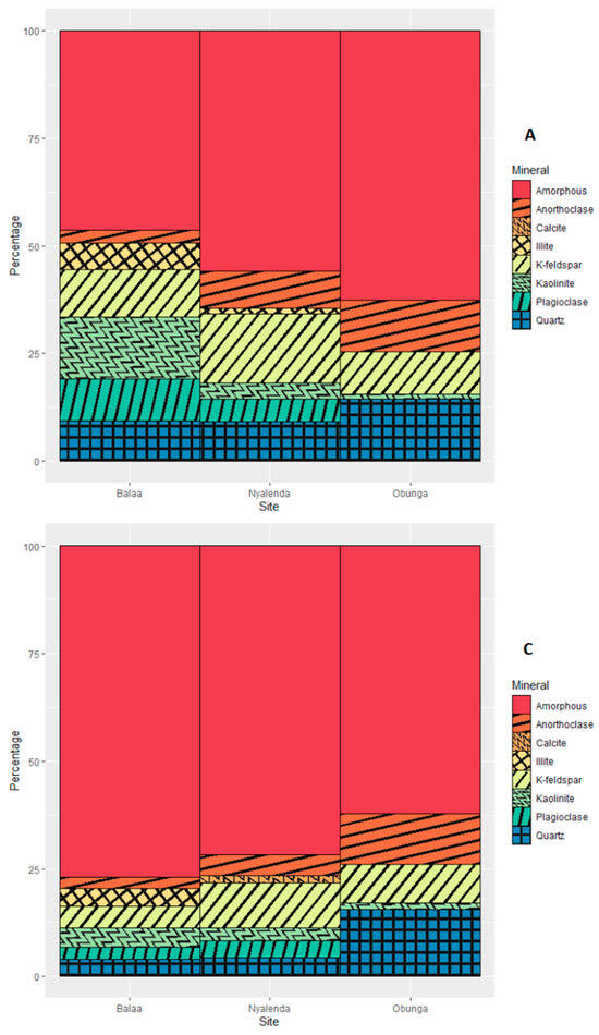 Figure 5 shows the average results of the XRD analysis for each site in Kisumu. The geology around Kisumu is diverse as it is surrounded by phonolites, with granites to the north, basanites and pyroxenites to the east, and carbonatites to the south. Whereas fast weathering minerals like zeolites, nepheline, and even pyroxenes have been weathered, more common primary minerals like K-feldspar, plagioclase, and anorthoclase are still abundantly present. On the whole, the Nyalenda and Balaa sites were more diverse in soil minerals than the Obunga soil, the latter probably being more influenced by the mineralogy of the nearby granites. With content of 14–15%, quartz was more prevalent in the Obunga soils than in the Nyalenda or the Balaa soils, where there was ca. 10% quartz in the A horizon and ca. 4% in the C horizon. The Nyalenda soil was relatively rich in K-feldspar and anorthoclase, with 16.1% and 8.9% in the A horizon (Figure 5). Furthermore, illite and plagioclase were found in the Nyalenda and Balaa soil, but had no or limited presence (<2–3% of the sample) in the Obunga soil. It should be noted that almost all samples from the Kisumu sites contained considerable amounts of a smectite-like mineral, but, because the mineral was poorly crystalline, these were included in the amorphous category and not separately quantified (Figure 3). It is not possible to state which types of smectite minerals were present in the soil based on their elemental composition.