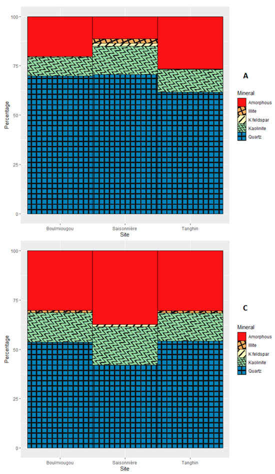 Being derived from a rather homogenous hinterland of granites, granodiorites, and diorites, the soil mineral composition at the Ouagadougou sites (Figure 6) was less diverse than that of the Kisumu sites (Figure 5). All primary minerals, like amphibole, plagioclase, and biotite, were absent, while K-feldspar was only found in trace amounts. Compared to the Kisumu soils, the quartz content was higher, and the smectite-like mineral that was present in the majority of the Kisumu samples was found in none of the Ouagadougou samples. Accordingly, the percentages of amorphous materials as estimated through quantitative XRD analysis were significantly lower in the Ouagadougou samples (Figure 5 and Figure 6). The origin or composition of the amorphous materials of the Ouagadougou is unknown. Whereas plagioclase and anorthoclase were still present in Kisumu soil, plagioclase in Ouagadougou had all been converted to kaolinite. The soils with the highest variability on average in their mineral composition were those at the La Saisonnière site (Figure 6). The soils at the Boulmiougou and Tanghin sites were relatively similar in their total mineral composition. The Boulmiougou site showed a minimal amount of K-feldspar and only had trace amounts of illite, and the Tanghin site soils showed no K-feldspar and a minimal amount of illite (Figure 6). The amount of amorphous materials at the Ouagadougou sites was higher in the C horizons at all three sites than in their A horizons.