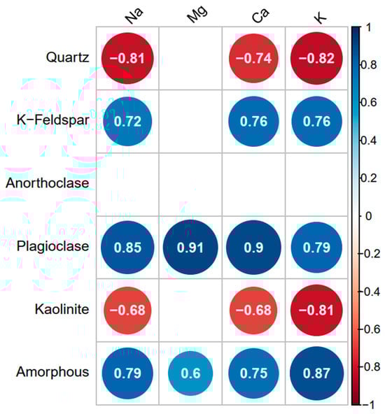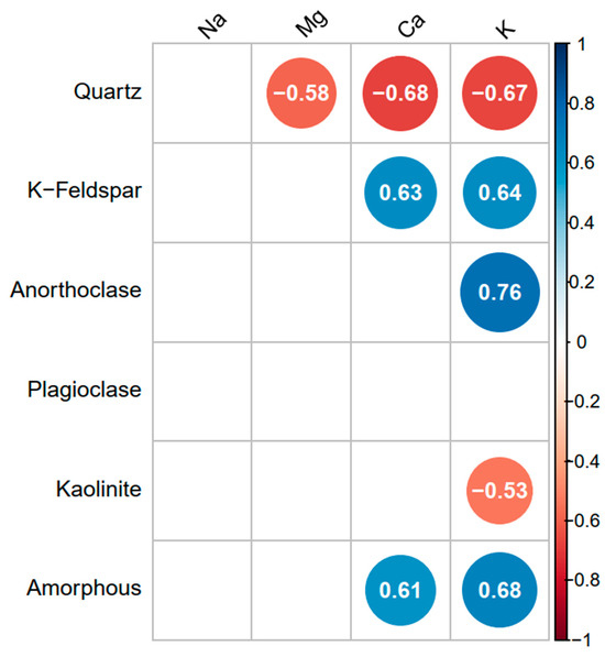 Pearson correlation coefficient diagram for the elemental content and soil mineral composition of the C horizon samples. Correlations are only displayed if significant at the 0.05 level.