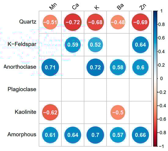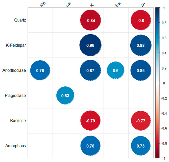 Pearson correlation coefficient diagram for the elemental content and soil mineral composition of the A horizon samples. Correlations are only displayed if significant at the 0.05 level.