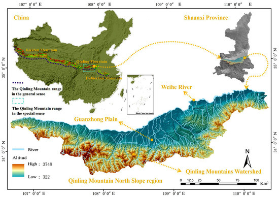 The Qinling Mountain Range is a vast mountain system running west to east across the Chinese mainland, which is not only the demarcation line between the Yangtze River Basin and the Yellow River Basin but also the cradle of Chinese civilization. Starting from the Shang (ca. 1600 BC–1046 BC) and Zhou (1046 BC–256 BC) dynasties, and passing through the Qin (221 BC–207 BC), Han (202 BC–220 AD), Jin (266 AD–420 AD), Sui (581 AD–618 AD), Tang (618 AD–907 AD), and Bei Song (960 AD–1127 AD) dynasties, many of the dynasties in the history of China that have had a significant impact on Chinese civilization have built their capitals in the region [21]. There is both a general and a special definition of the Qinling Mountains. In the general sense, the Qinling Mountains start from the Kunlun Mountains in the west and extend eastward through Shaanxi to the Zhangbaling Mountains in Anhui Province. In the special sense, the Qinling Mountains are between 32° and 35° north latitude, stretching across south-central Shaanxi Province, extending 400 to 500 km from west to east and 100 to 150 km from north to south, with ridges at an elevation of about 2000 m and peaks at more than 2000 m above sea level, with the highest peak, Taibai Mountain, at an elevation of 3771.2 m above sea level, rising about 3000 m above the valley of the Weihe River. The research in this paper is based on the Qinling Mountains in the special sense.