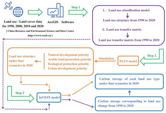 Terrestrial ecosystems possess a robust capacity for carbon fixation by capturing CO2 through vegetation, soil, and other biomass components. They play a pivotal role in regulating, transforming, and cycling regional carbon storage [1,2]. Land use reflects the structural attributes of terrestrial ecosystems and is influenced by human utilization, alteration, and other human activities. Over the long-term interaction between humans and terrestrial ecosystems, land use/land change (LULC) has emerged as a crucial indicator of the evolution of land use patterns [3]. Furthermore, it has significantly impacted alterations in carbon storage within terrestrial ecosystems [4]. Therefore, utilizing land use change data becomes a crucial method for investigating the region’s spatiotemporal evolution of carbon storage [5,6].
