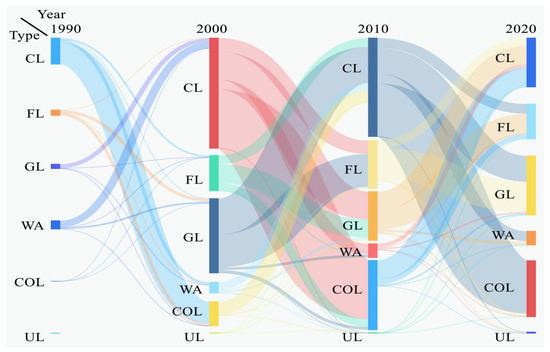 The findings indicate that the most substantial changes in the region occurred within the CL and COL categories over the preceding three decades. Figure 4 illustrates the conversion of the various land use types from 1990 to 2020, with the wider connected curves indicating more significant change data. The dramatic changes in CL and COL can be well-visualized in the figure.