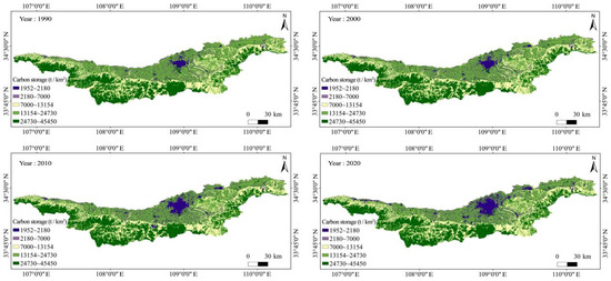 Carbon storage spatial distribution from 1990 to 2020.