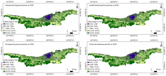 Carbon storage spatial distribution under four scenarios in 2030.