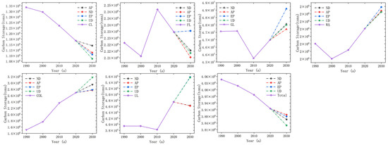 Carbon storage changes in various land use types from 1990 to 2030.