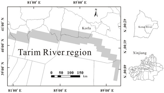 The Xinjiang Uyghur Autonomous Region is situated in northwestern China. As shown in Figure 1, this region is the largest Chinese administrative division, with a total land area of more than 1.66 million km2. Due to the extremely low precipitation and intensive evaporation in this area, most of the rivers in Xinjiang are fed by the snowmelt of the surrounding mountain ranges [33,58]. As a result of excessive and inefficient water consumption in the upper and middle reaches, many rivers and lakes have begun to dry up, dating back to the 1970s. Specifically, the Tarim River region, which is located in the central part of Xinjiang, has witnessed a substantial decrease in riparian vegetation (e.g., Populus euphratica) and wildlife.