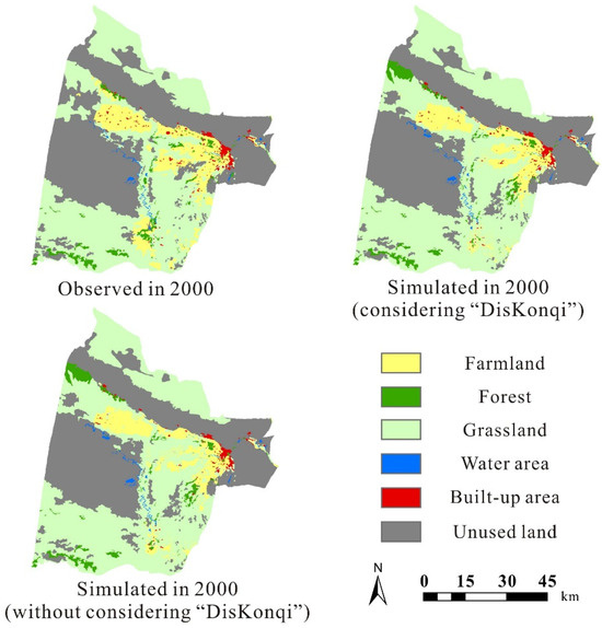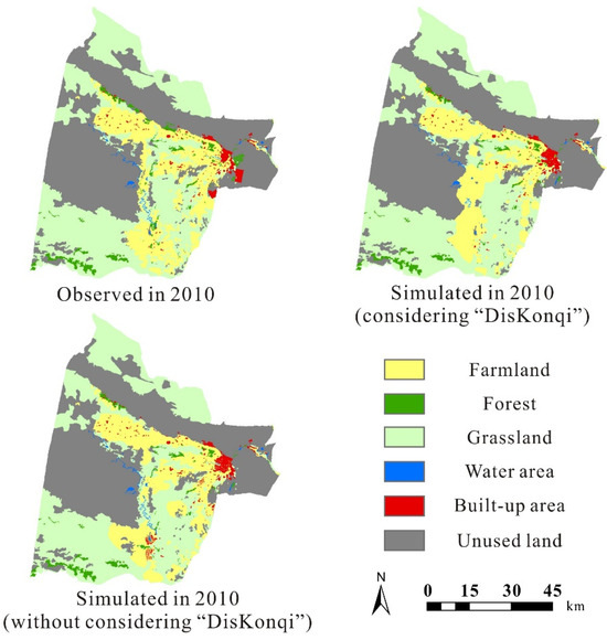 Generally speaking, three years (e.g., Year 1, Year 2, and Year 3) of LULC datasets are necessary for the validation of LULC change modeling. More specifically, the LULC datasets in Year 1 and Year 2 are employed to calibrate the LULC change model, while the LULC datasets in Year 2 and Year 3 are employed to validate the generalization ability of the above calibrated LULC change model. To this end, firstly, the LULC change model in our research was calibrated according to the samples of LULC changes between 1990 and 2000. Secondly, we simulated the LULC changes during this period based on the calibrated LULC change model and compared the simulation result with the actual remote sensing classification data in 2000. This comparison can assess the performance of the above model calibration procedure. Thirdly, we further predicted the LULC changes between 2000 and 2010 with the support of this well-calibrated LULC change model. The prediction result was compared with the actual remote sensing classification data in 2010, which can adequately validate the generalization ability of the above calibrated LULC change model.