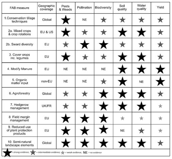 To address our research objectives, we conducted a widespread literature search to estimate the impacts of FAB measures. A literature survey was conducted using keyword searches in the ISI Web of Science database (to September 2019) to extract potential articles, which were subsequently filtered by title and keywords, abstract and finally full publication content [14,15]. Combinations of the following keywords were used for literature searches: reduced/conservation tillage, agroforestry, hedgerow management, mixed crops/crop rotation, manure, sward diversity, field margins, pesticides, reduced pesticide protection, organic, carbon (C) storage. Studies from Europe were targeted, but for some options evidence is more geographically specialised, so other continents were included. We also utilised recent reviews of agri-environment options [16,17] and searched the reference lists of previous syntheses on related topics. We have included material from the academic literature and the grey literature (government reports—often peer-reviewed). We have also added elements from more recent research during manuscript preparation and review. Using the reviewed literature, each of the ten FAB measures was defined and assessed in terms of impacts on yield, biodiversity (here, biodiversity refers to biodiversity that supports ecosystem services of agriculture (FAB)—also covered by pollination and pests—as well as wider biodiversity at species or ecosystem level; this varies by individual study), pollination, pests and diseases, soil quality, carbon sequestration and greenhouse gas (GHG) emissions, water quality and conservation. The strength of evidence was recorded for each FAB measure using the following categories: weak (evidence from only a few studies or contextually limited, e.g., geographically), intermediate (some evidence but not fully conclusive, contested, some contextual limitations), strong (large number of studies across range of contexts). Subsequent assessments of the co-benefits and trade-offs, magnitude, timescale, spatial issues, displacement, longevity, climate interactions, and social and economic barriers were made for each of the identified impacts of measures.