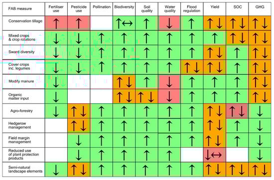 Selected FAB measures and their contribution to ecosystem service provision and farm management. GHG = GHG emissions, SOC = soil organic carbon, ↓ = decrease; ↔ = no significant effect, ↑ = increase. The cells have been shaded green (positive effect on ES), red (negative effect on ES), orange (mixed). Presence of multiple arrows indicates good evidence for different effects, often depending on specific context.