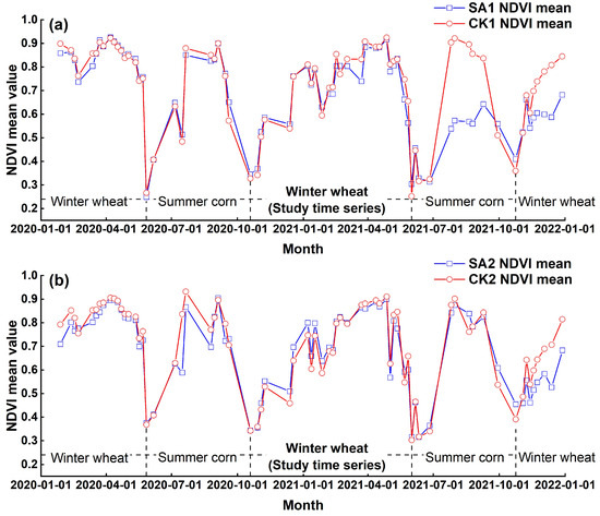 - It should be noted that although the Sentinel-2 data selected in this study were characterized by short revisit cycles, and the effect of cloud shading resulted in irregular time series intervals, which is not conducive to understanding the hidden patterns in the time dimension of remote sensing data and to some extent affects the accuracy of the crop health status and phenology division. In the subsequent research, attempts can be made to introduce deep learning algorithms to predict the missing data in the time series by utilizing the existing time series data; attempts can also be made to introduce SAR data to assess the growth and health of winter wheat in order to overcome the influence of meteorological factors on the time series. In addition, although the selected CKs were closer to SAs, which could exclude the phenological differences caused by meteorological factors, it was undeniable that the differences in the amount of fertilizer applied to different croplands and winter wheat varieties would interfere with the experimental results. The uncertainties of mining subsidence in time and impact area were a difficult problem to solve. The solution to this problem requires deep cooperation with mining units to obtain information on mining routes and mining times. The subsidence areas (SAs) and check areas (CAs) are selected on the surface of the mining workings, and variables such as the amount of fertilizer applied and the variety of winter wheat in the SAs and CAs are strictly controlled using the control variable method. In addition, a good data collection program needs to be designed so that the effects of mining subsidence on crop growth and health can be more accurately obtained.