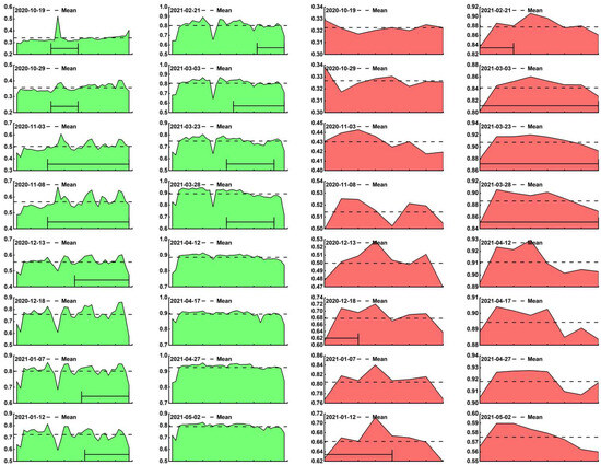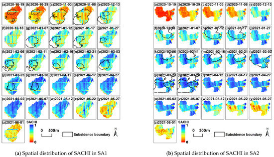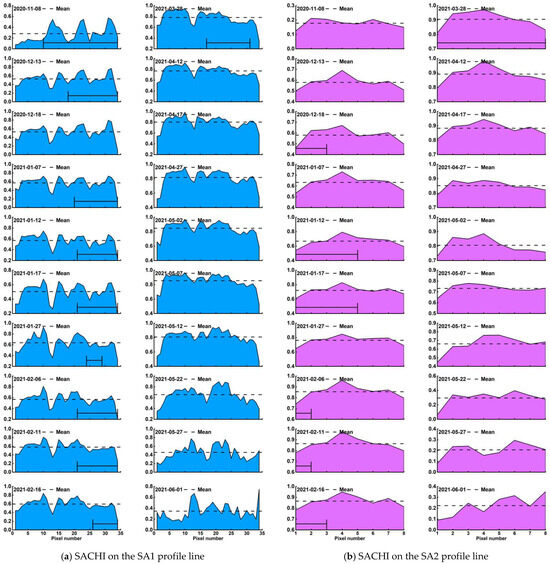 - In the SA1, there were 16 periods of profile lines with some pixels in the impact area of mining subsidence. Except for four periods of 19 October 12020, 29 October 2020, 3 November 2020, and 8 November 2020 where the DN in the subsidence area were mainly greater than the SACHI mean, the remaining 12 periods were predominantly lower than the SACHI mean and showed a fluctuating downward trend.