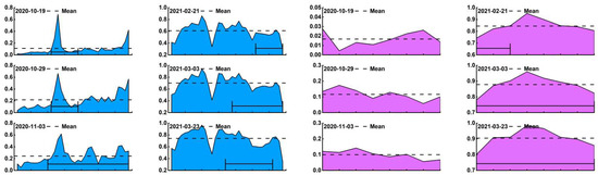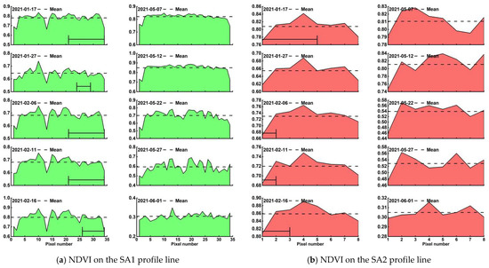 - The SA2 area was first impacted by mining subsidence on 18 December 2020, and a total of 26 time-series NDVI profile lines were obtained, with part of the 10 profile lines located within the impact area during the advancement of the mining workings. It could also be seen that there was a fluctuation phenomenon in the NDVI of the area affected by mining subsidence, but the change characteristics were not clear because the fewer pixels on the profile lines.