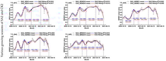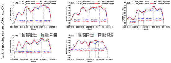 - There were some differences in the change magnitude of winter wheat growth monitored using different vegetation indices, among which the vegetation indices with the larger differences were NDRE2 and MREDVI. From the calculation results in Section 4.2, it could be found that the Gaussian multi-peak R2 (goodness of fit) of MREDVI was poor compared to NDRE2, which indicated that NDRE2 could be used as an optimal indicator to monitor the differences in winter wheat growth.