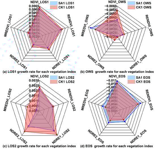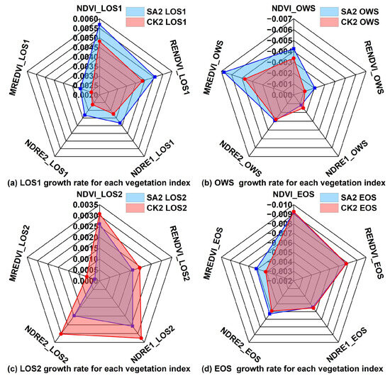 - Compared with the CK1, the change amplitude of each vegetation index corresponding to the growth rate in SA1 was mainly negative in the LOS1, OWS, and LOS2, except for the positive value in the EOS. Mining subsidence resulted in the delayed growth and development of winter wheat in the SA1 compared with the CK1, and the accelerated rate of decline and maturity compared with the CK1.