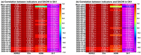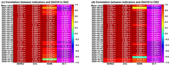 - NDRE2, CIre and NDMI were all positively correlated with SACHI, with mean correlation coefficients ranging from 0.979~0.981 (p < 0.01), 0.974~0.980 (p < 0.01), and 0.884~0.912 (p < 0.01), respectively. It indicated that the above three indicators were highly correlated with and positively affected the health status of winter wheat.