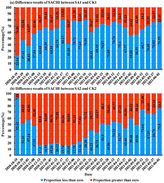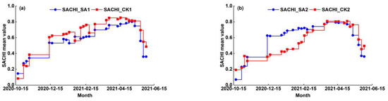 - In the SA1, PC1 contribution rate of the SACHI model ranged from 77.85% to 97.36%; In the SA2, PC1 contribution rate of the SACHI model ranged from 57.41% to 97.20%, which indicated that the constructed SACHI model gathered the vast majority of information from the four components in both areas. In addition, PC1 contribution rate of the SACHI model constructed in the CK1 and CK2 ranged from 68.91%~96.70% and 67.67%~97.66%, respectively, which also indicated that the SACHI model was able to synthesize most of the information from the four components in the CKs.