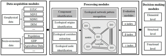 - Wang, G.; Yu, Q.; Yang, D.; Zhang, Q.B.; Yue, D.P.; Liu, J.H. Study on the construction method of hierarchical ecological network in Baotou City. Trans. Chin. Soc. Agric. Mach. 2019, 50, 235–242+207. [Google Scholar]