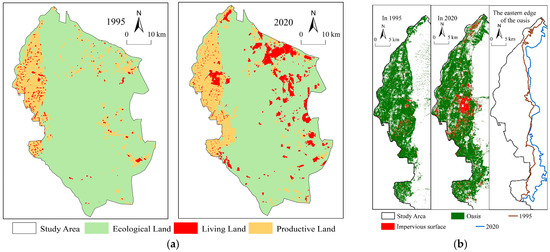 - The whole desert–oasis system shows the characteristics of oasis expansion and desert retreat, and the spatial pattern of land is clearly divided into functional divisions. From 1995 to 2020, the boundary between the eastern edge of the oasis and the desert showed an eastward expansion trend, and the expansion amplitude was more significant in the northeast and southeast sections of the oasis. The extent of sandy land shrunk significantly.