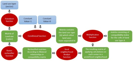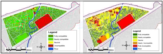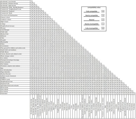 - Taleai, M.; Sharifi, A.; Sliuzas, R.; Mesgari, M. Evaluating the compatibility of multi-functional and intensive urban land uses. Int. J. Appl. Earth Obs. Geoinf. 2007, 9, 375–391. [Google Scholar] [CrossRef]