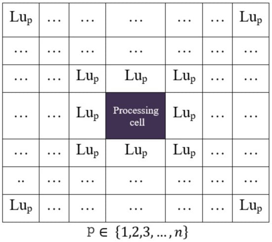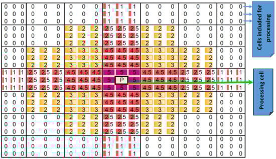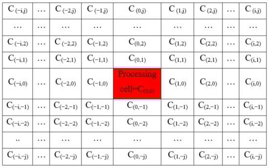 - The variable “m” represents the distance from the central cell to the edge of the neighboring radius in the x-axis, which is calculated as (x − 1)/2.