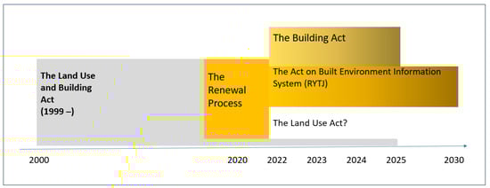 The critical feedback made the Ministry of the Environment separate the proposed legislation into three related Acts (Figure 1): 1. The Building Act [32] in which the design of the building process is introduced; 2. The Act on the Built Environment Information System (Rakennetun ympäristön tietojärjestelmä, RYTJ, in Finnish; [33], which seeks to become a steering and evaluation mechanism, not merely a container of urban and real estate data. RYTJ also defines the digital implementation of the third act; 3. The Land Use Act (not yet drafted). The new Acts will comprise novel contents, which will need a legislative process of their own, although the current Land Use and Building Act has integrated all the phases of planning and building.
