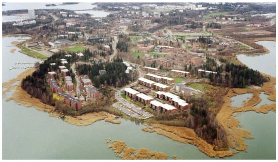 Otaniemi neighbourhood (CC-BY-SA-3.0-migrated, https://commons.wikimedia.org/wiki/File:Otaniemi_from_air.jpg (accessed on 10 October 2023)).