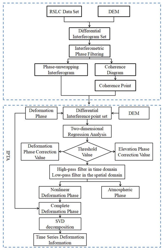 IPTA technology interferes with Permanent Scatterers (PS) point sets that have stable spectral characteristics or high backscattering characteristics on Single Look Complex (SLC) data. The interference points, including the terrain phase, deformation phase, atmospheric phase, and phase noise are obtained. Compared to conventional PS-InSAR technology, this approach stores intermediate data in a vector format, which can significantly enhance the speed of data calculation [26,27]. However, its ability is often limited when processing wide-format data, such as Radarsat-2 data, for whole-format processing. However, SBAS-InSAR technology has low requirements for the monitoring range and is suitable for complex scenarios [12]. Therefore, this study utilized SBAS-InSAR technology and IPTA technology to accomplish the processing of SAR image data. The main technical process is shown in Figure 2.