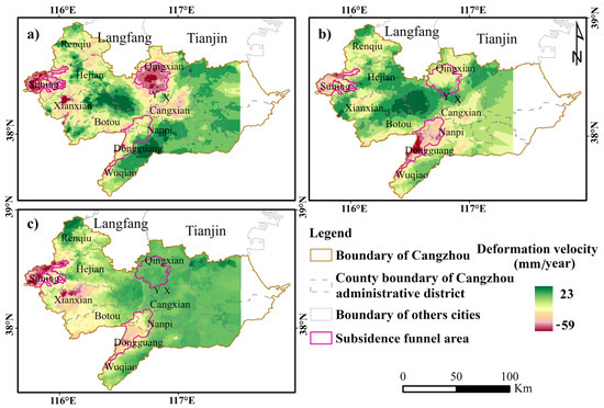 Distribution of the average subsidence rate in Cangzhou from 2004 to 2020 ((a) from 2004 to 2010; (b) 2012–2016; (c) 2016–2020).